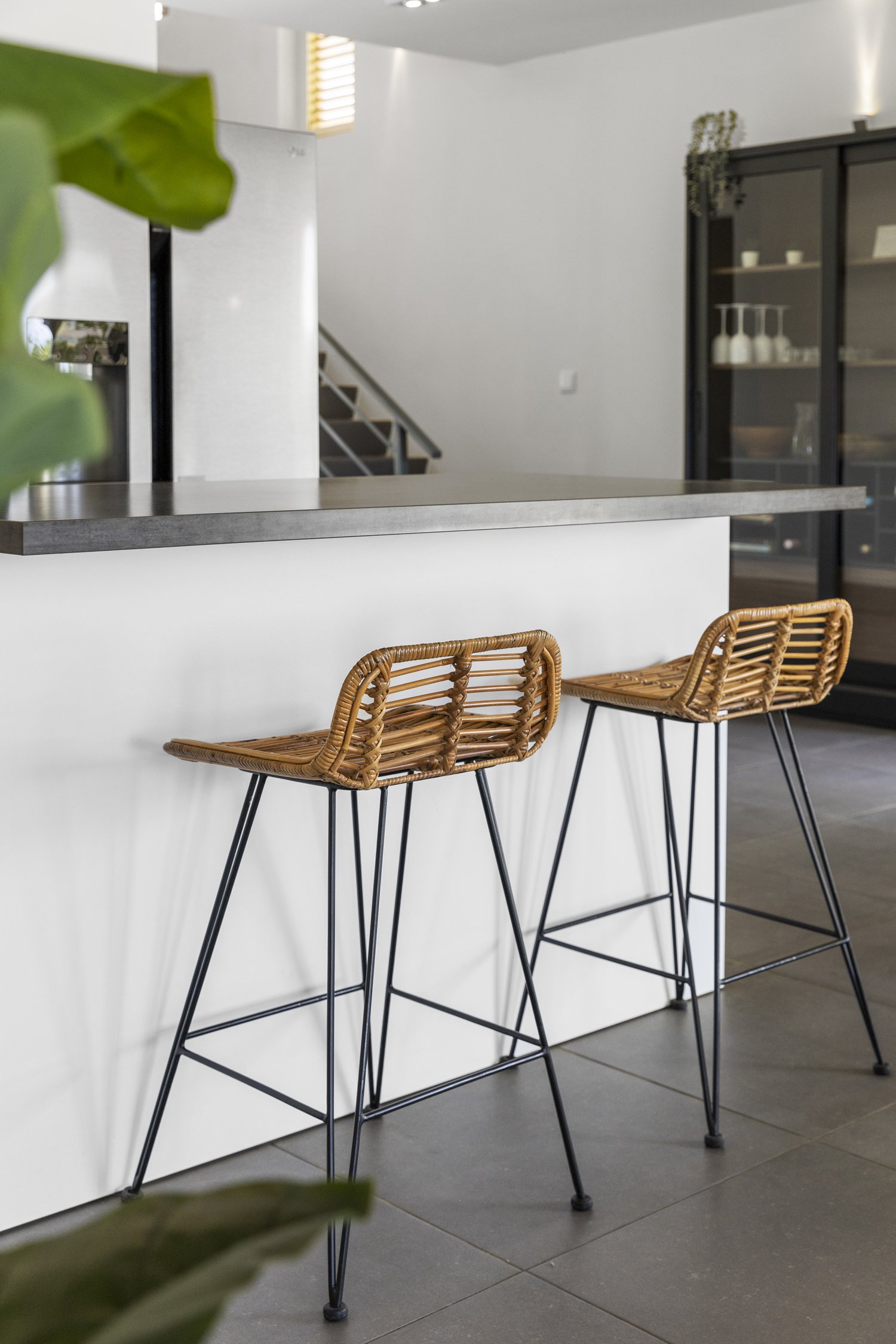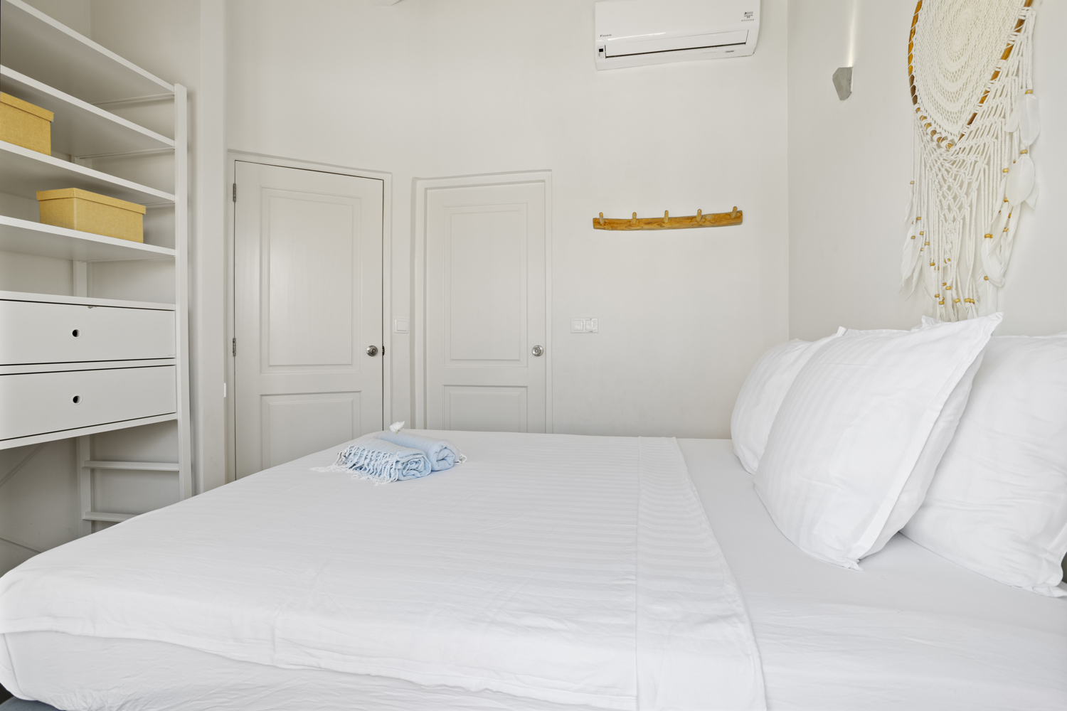 The room has an open kitchen and can be opened completely by several sliding doors so that a lovely cooling breeze blows through the whole villa. From the room, there is a shaded porch with a sitting and dining area where you can also spend the day.